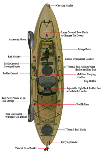 The Outback also comes with four rod holders, a bow hatch, two 8″ twist and seal hatches, a small mesh stowage pocket, an adjustable high back padded seat with inflatable lumbar support, a twist and stow rudder and easy access rudder controls. It also boasts a large rear cargo area with bungee tie downs and four carrying handles.
